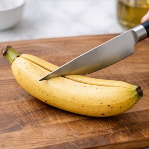 Take your medium banana and place it on a cutting board. Using a sharp chef’s knife, cut the banana lengthwise—but here’s the key technique: don’t cut all the way through. You want to cut about three-quarters of the way down the side, stopping before you hit the other side.