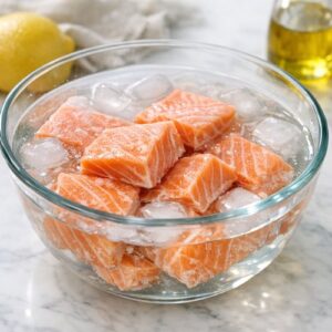 Never use hot water. Never microwave it. These shortcuts destroy the fish’s delicate cellular structure and you’ll end up with mushy salmon that falls apart in your air fryer.