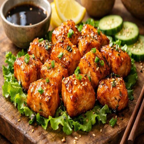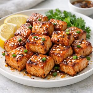 Transfer your hot salmon bites to a serving plate and rest for 2-3 minutes. This allows the exterior to set and the heat to distribute. The resting period is brief but meaningful—it's the difference between restaurant-quality and rushed.