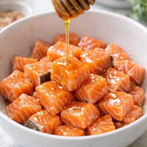 Place your salmon cubes in a bowl. Drizzle with the hot honey first—about 2 teaspoons total. This acts as a binder that helps dry seasonings stick. Then sprinkle in your garlic powder, paprika, kosher salt, and black pepper. If you're using the optional Dijon mustard, add it now with a squeeze of fresh lemon.