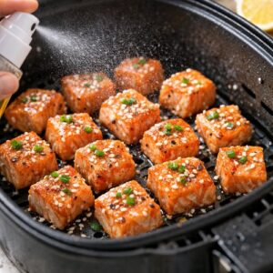 Give your salmon bites a quick mist of olive oil spray or toss with that teaspoon of olive oil. This is essential for air fryer cooking—it helps them brown and prevents sticking. Arrange them in a single layer in your air fryer basket. They can touch slightly, but avoid stacking.
